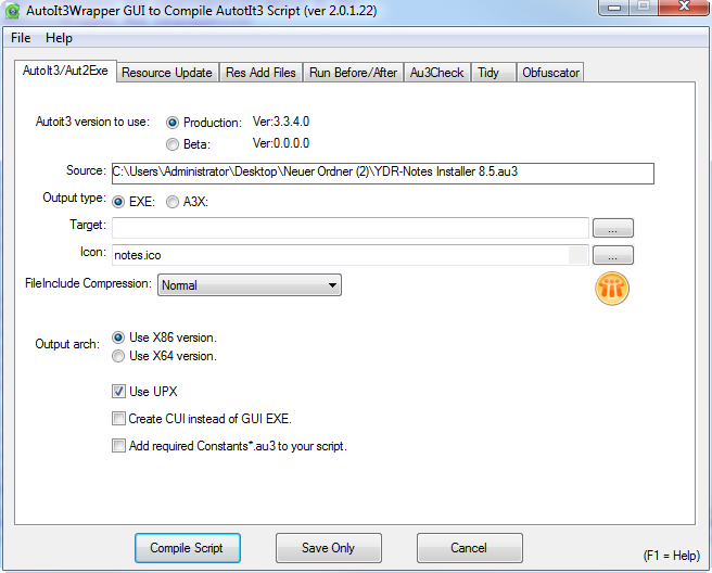 Zum Kompilieren nimmt man am Besten die volle Scite Editor Version, die es bei Autoit gibt, denn darüber kann man auch das Icon der erstellten Exe Datei ändern: