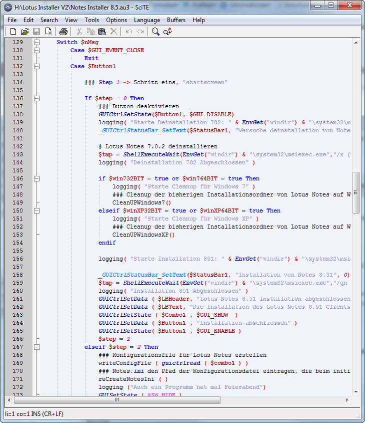 Zuerst wird der alte Notes Client (anhand der Software GUID) mit Msiexec deinstalliert (7.0.2). Danach werden diverse Verzeichnisse umbenannt, die vorkonfiguriert wurden (installerconfig.ini). Hierbei habe ich natürlich darauf geachtet, dass auch alle Profilverzeichnisse auf einem Computer durchsucht werden und alle Ordner rekursiv umbenannt werden. Danach wird der 8.5.1er Client installiert. Natürlich ist es notwendig dass der Installer im selben Verzeichnis liegt, wie der entpackte Notes Client, bzw. man die korrekten Pfade angibt, damit der Installer den Pfad zum neuen Client auch findet. Nach der 8.5.1er Installation kann man über ein Drop Down auswählen mit welchem Server (in meinem Fall sind es 2) der Client sprechen soll. Nach dem Auswählen wird eine conf.txt gespeichert und diese mit dem Parameter " ConfigFile" in die Notes.ini eingefügt. Somit zieht sich der Notesclient beim initialen Start die Configurationsdatei und hat schon alle angaben, so dass der Benutzer nur noch seine Userid eingeben muss und danach direkt nach dem Passwort aufgefordert wird.