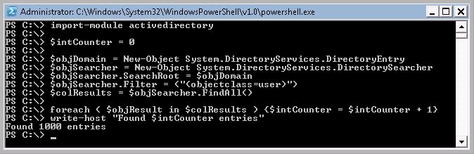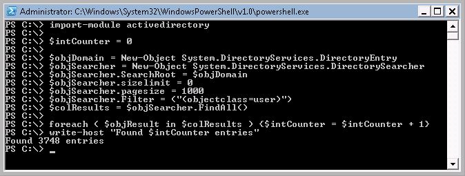 Whats the difference between supersonic and the directory searcher? Nothing, because if you get over ~1000 you crash into a wall. :) Last week we had to deal with the limitations on the directory searcher. We performed a user search on an organizational unit (subtree) with more than 1000 users beneath. We where astonished that our userobject only contained 1000 items every time we did the search. I wrote a little test script in powershell to reproduce this behaviour and to see if this limitation is a C# problem or not.