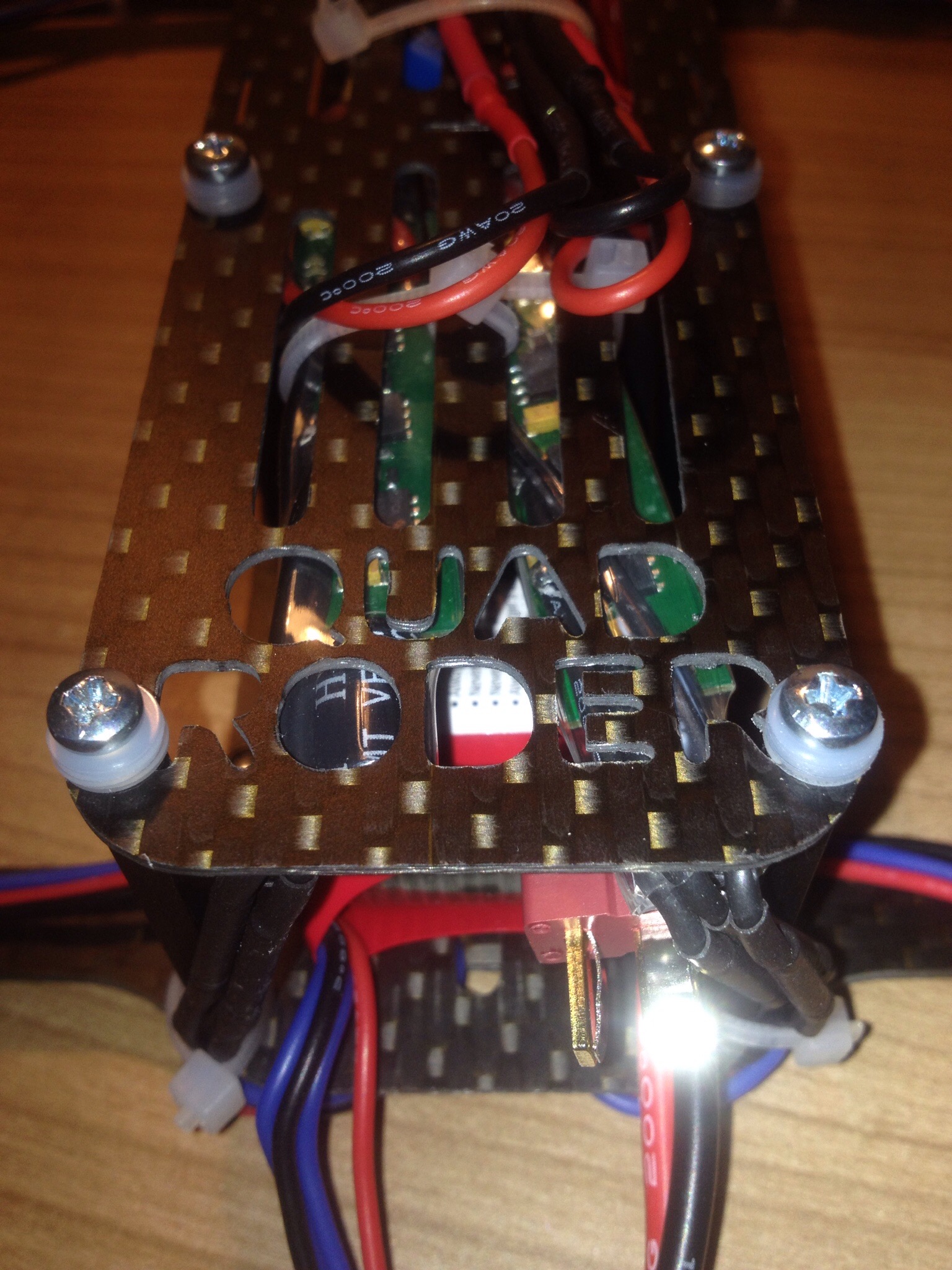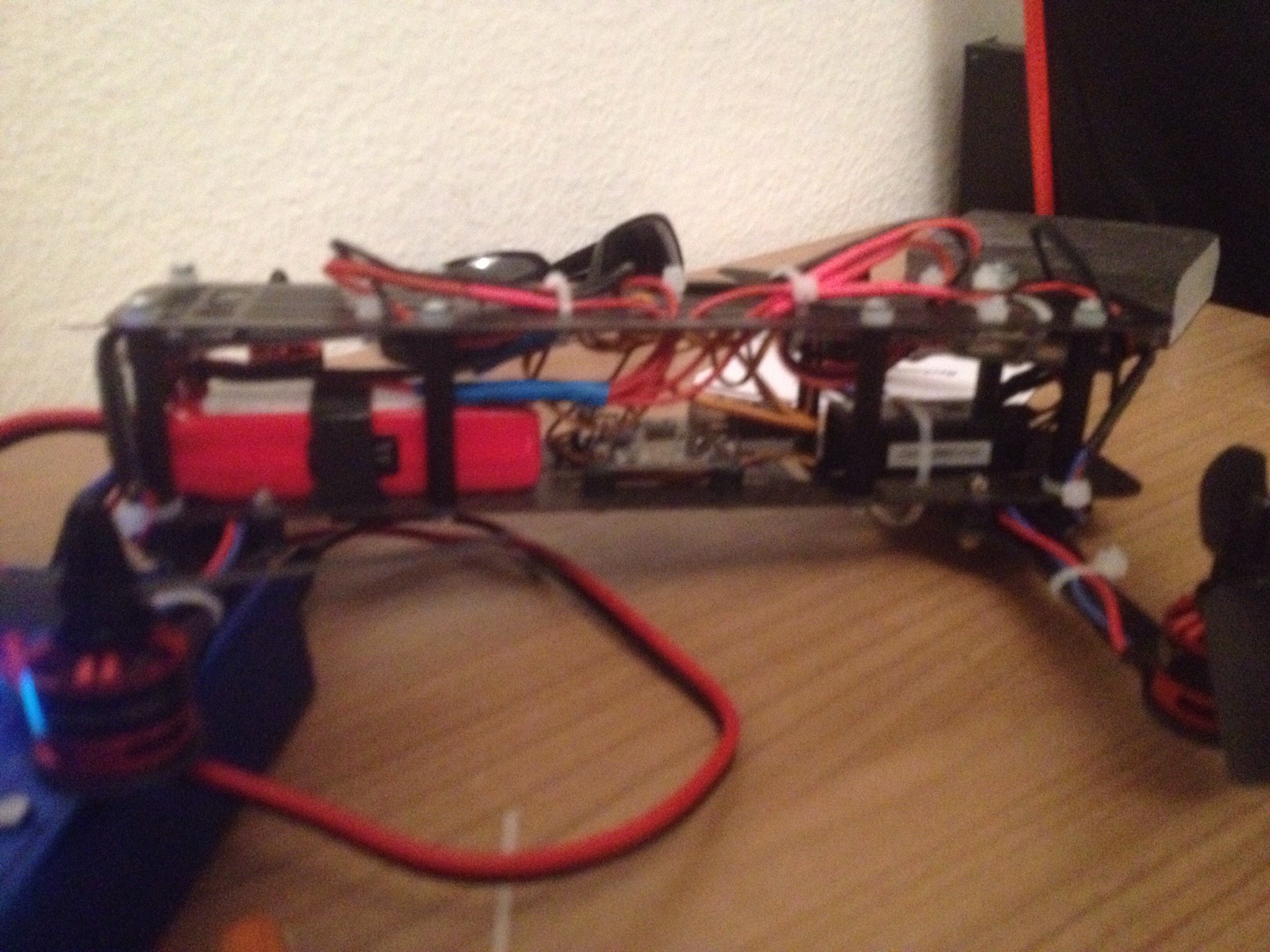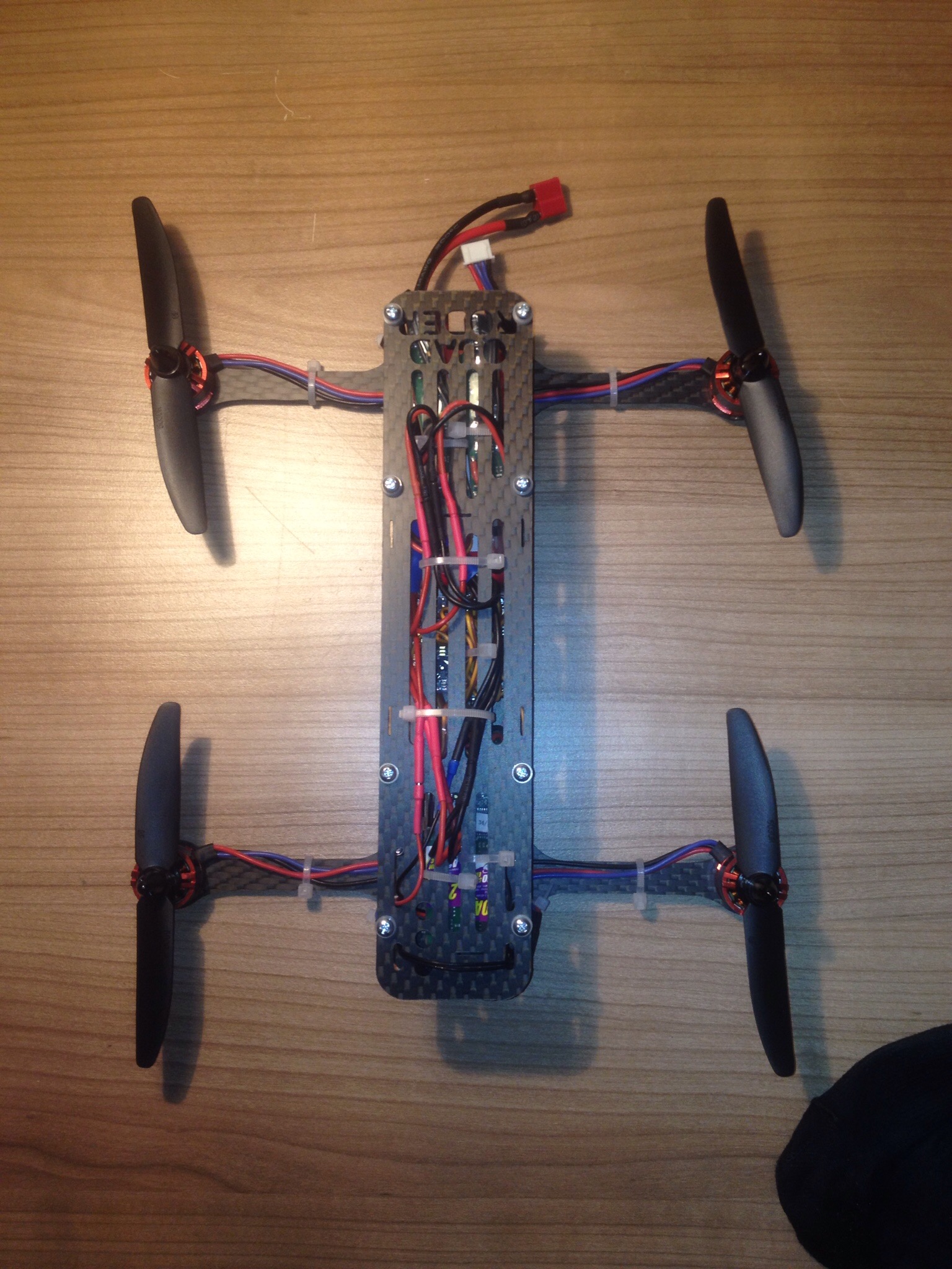 Nach dem ich den Rahmen und die Motoraufhänger gefräst hatte ging es nicht lange, bis ich den kompletten Quadcopter (Ich habe ihn mal Quadroder getauft) zusammengebaut hatte. Wie designed passten alle Teile 1A auf den Rahmen, so dass der Zusammenbau schnell und einfach von statten ging. Ich muss zugeben, dass das Projekt fast schon zu einfach zu bewerkstelligen war :).