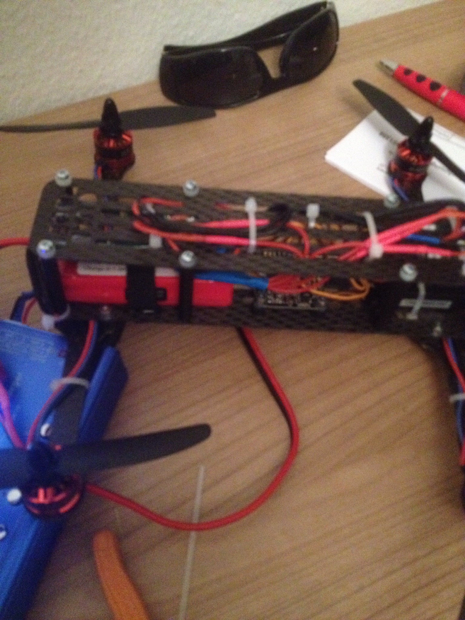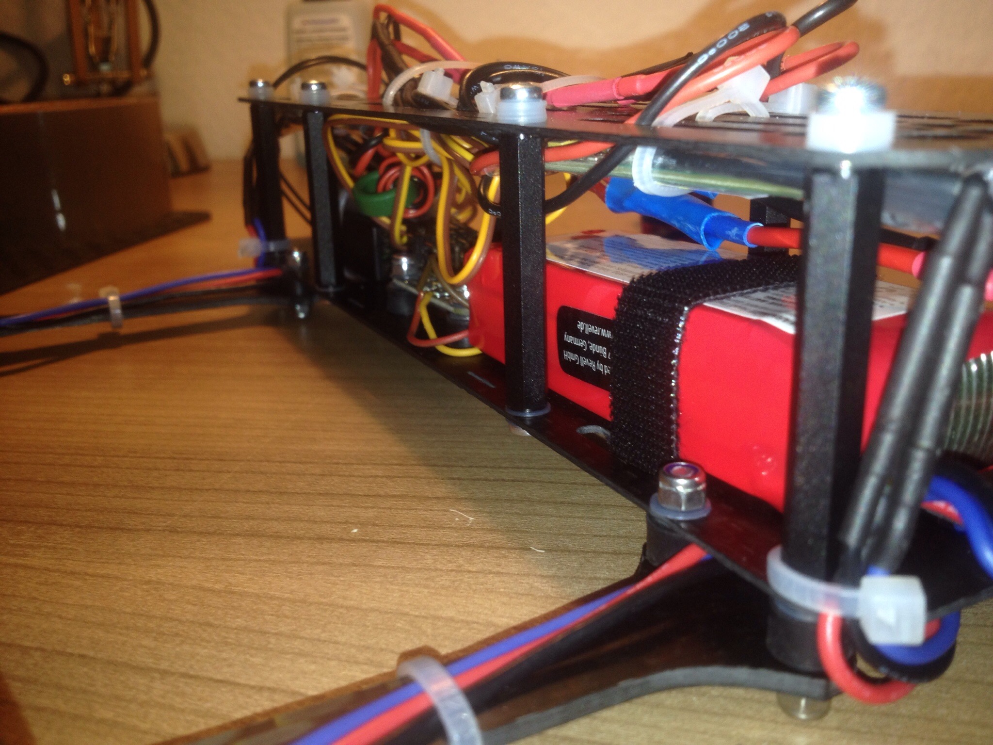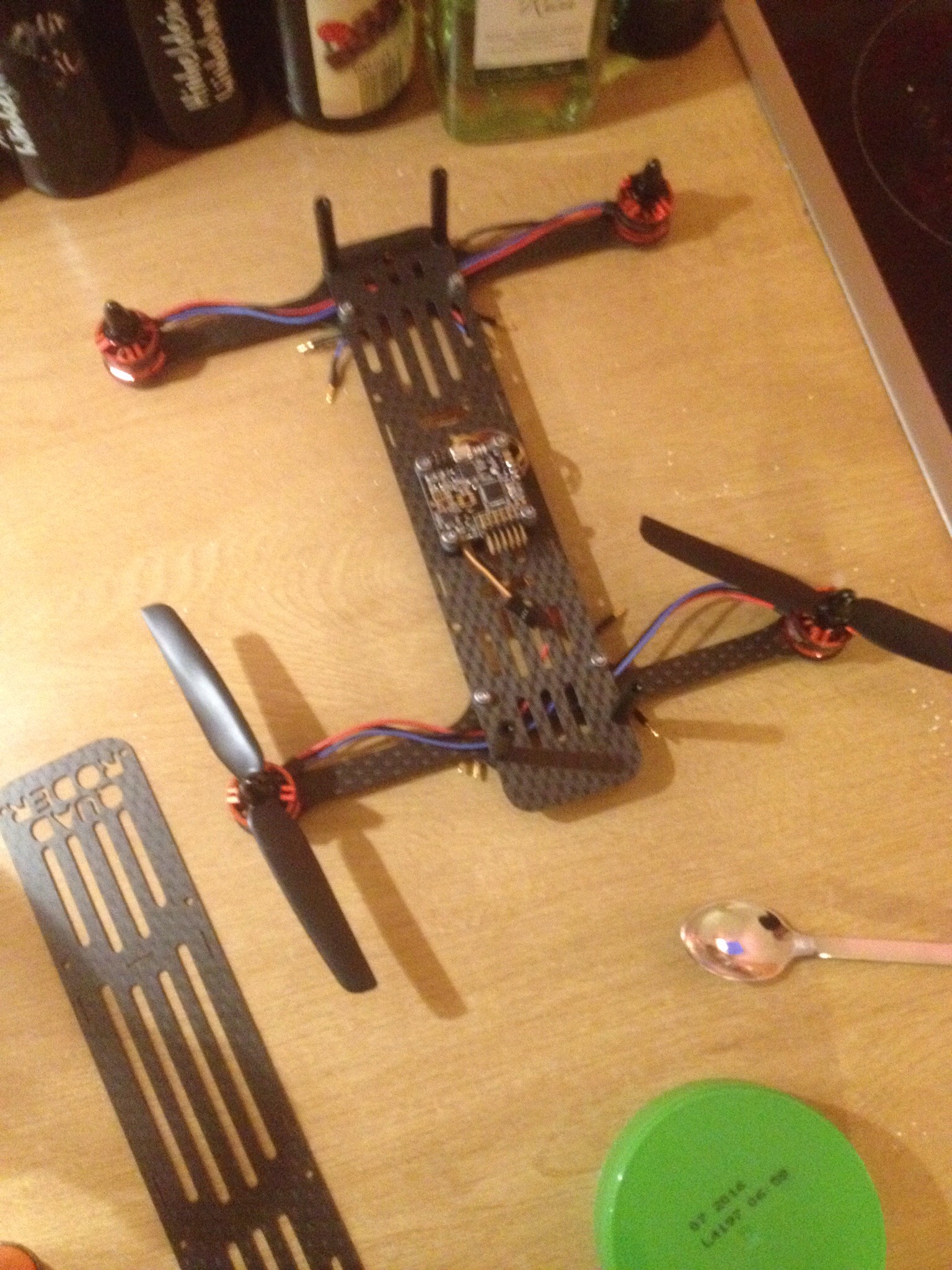 Nach dem ich den Rahmen und die Motoraufhänger gefräst hatte ging es nicht lange, bis ich den kompletten Quadcopter (Ich habe ihn mal Quadroder getauft) zusammengebaut hatte. Wie designed passten alle Teile 1A auf den Rahmen, so dass der Zusammenbau schnell und einfach von statten ging. Ich muss zugeben, dass das Projekt fast schon zu einfach zu bewerkstelligen war :).
