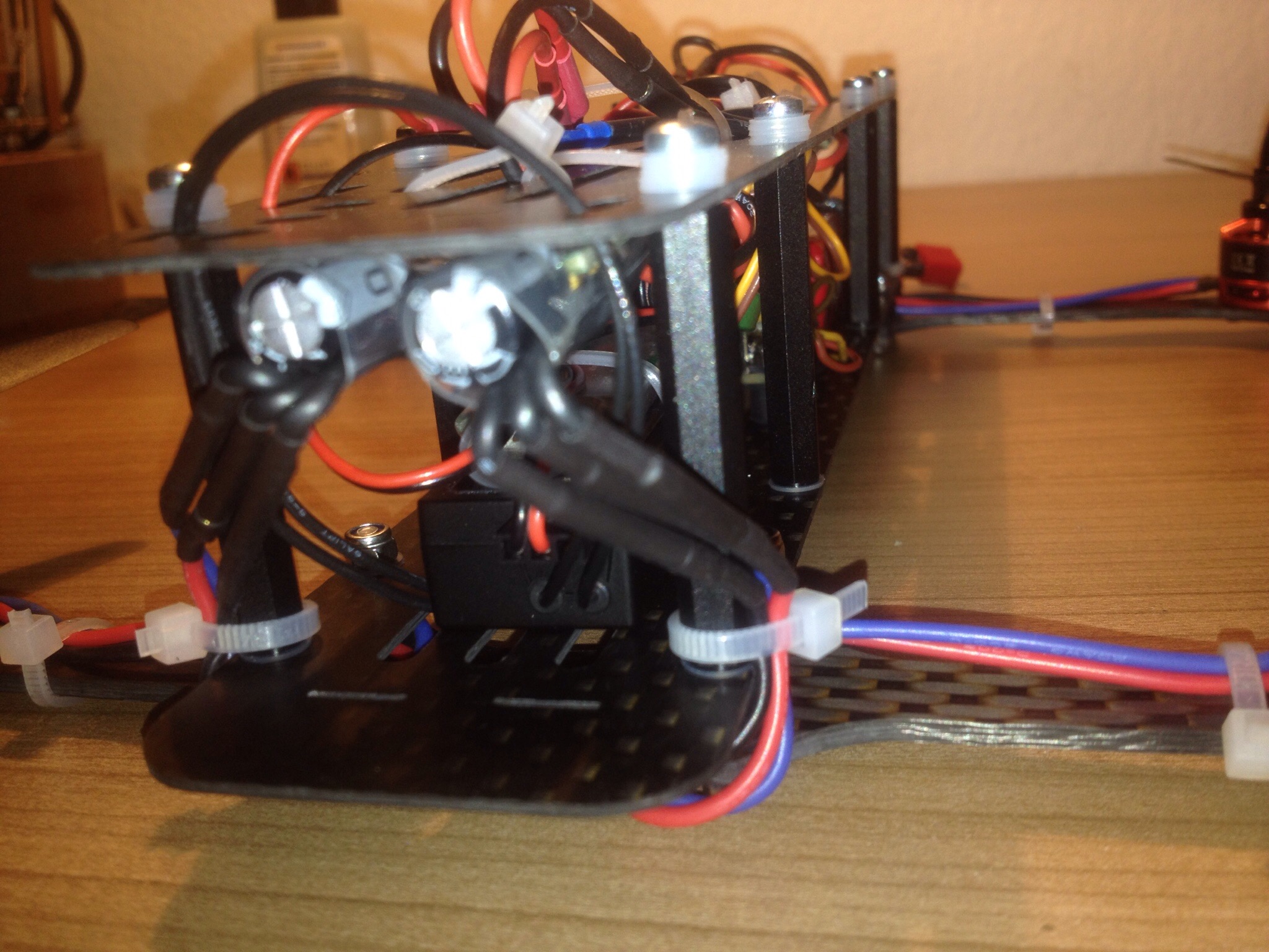 Nach dem der Quadroder zusammengebaut war ging es an die Software und die Anbindung an die Fernbedienung. Was ich vorher nicht bemerkt hatte war, dass die Regler kein BEC haben, also keinen Strom über den Stecker, der zur Flight Control Naze32 geht führen. Das heisst, dass alles Strom hat, bis auf den Regler und der Empfänger. Also habe ich kurzerhand einen uBEC auf Ebay für 7€ geschossen und diesen eingebaut, damit alles soweit versorgt ist.
